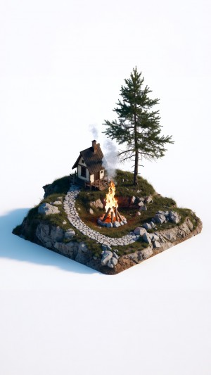 Cozy 3D isometric cabin with a crackling campfire