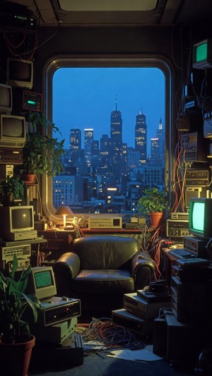 Retro-tech sanctuary overlooking a twilight urban sprawl
