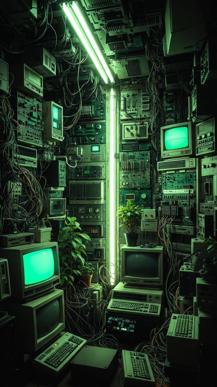 A striking vertical shot of a narrow, high-tech enclosure filled from floor to ceiling with retro computer hardware and complex wiring. A vertical green fluorescent light tube serves as the primary light source, casting a vibrant emerald glow across stacks of vintage CRT monitors, keyboards, and server racks. Several lush green potted plants are strategically placed among the tech, creating a vivid contrast between the mechanical and the organic. The chaotic yet organized arrangement of wires and glowing screens evokes a high-density cyberpunk dwelling or a hidden hacker's den.