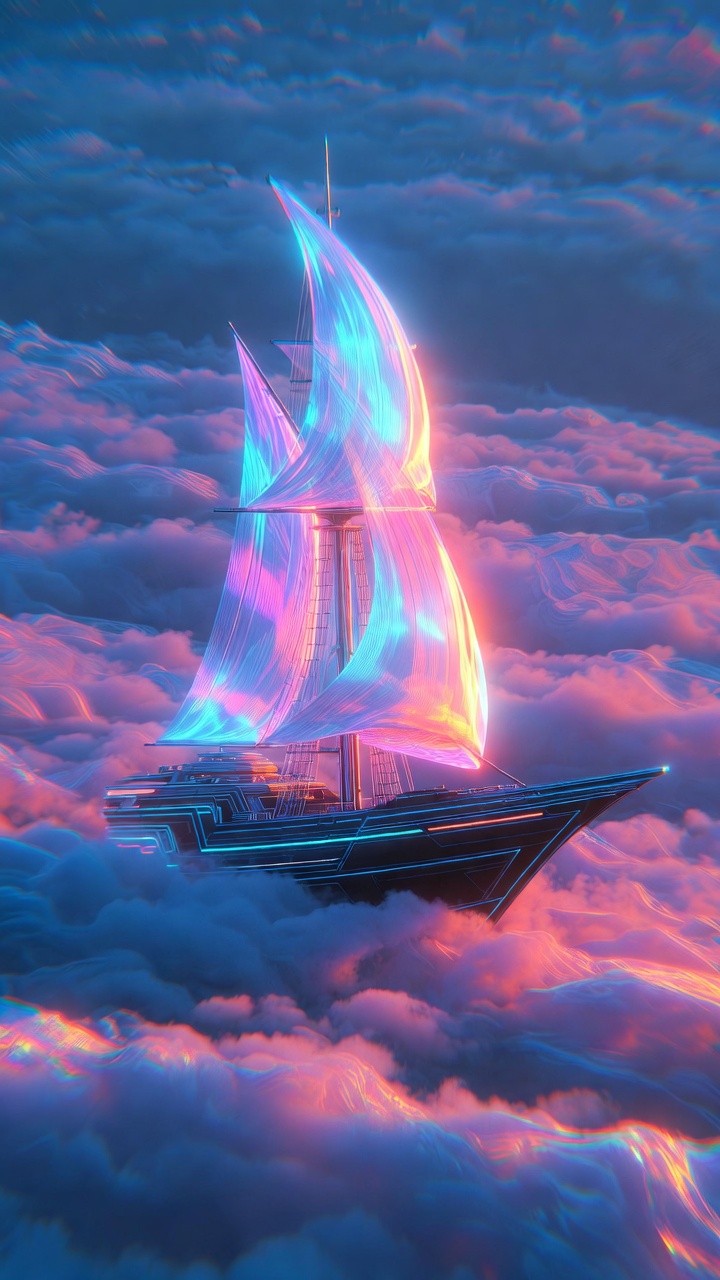 Set sail beyond the horizon into a realm of pure imagination. This mesmerizing live wallpaper features a majestic, futuristic galleon gliding smoothly through a sea of vibrant, fluffy pink and purple clouds. The ship's stunning holographic sails catch the light, shifting between brilliant neon blues and magentas. Merging classic maritime adventure with a dreamy, surreal aesthetic, this magical sky voyage will transform your screen into an absolute masterpiece.